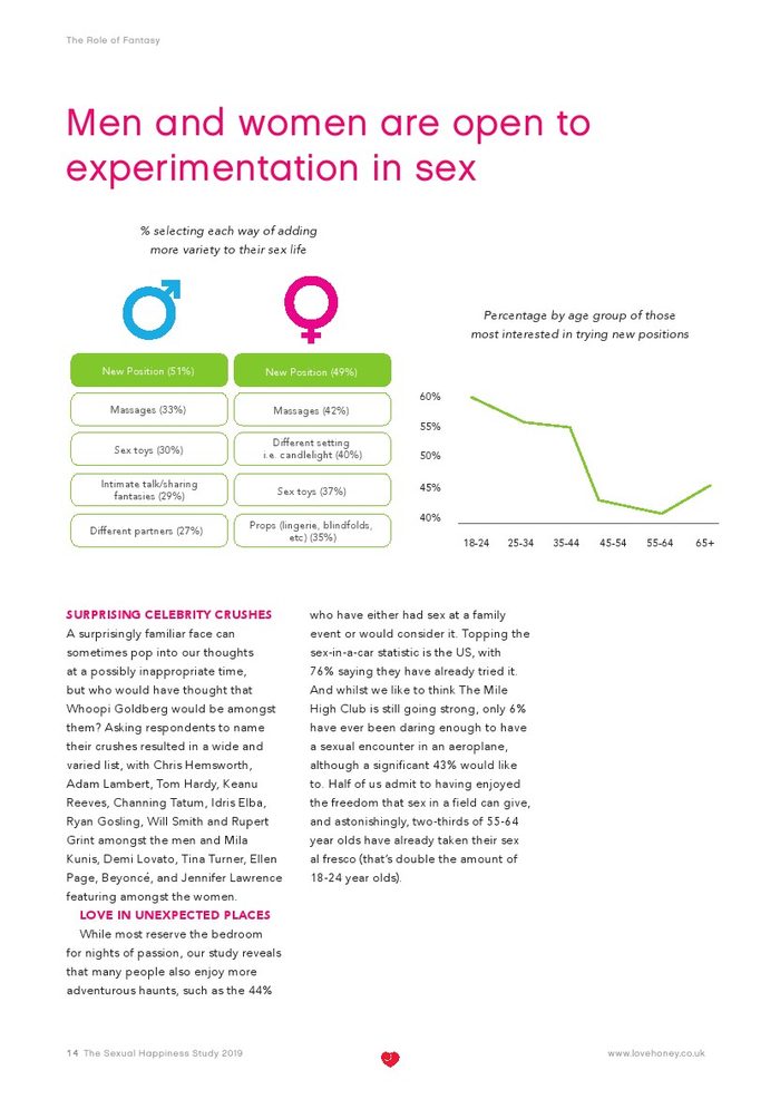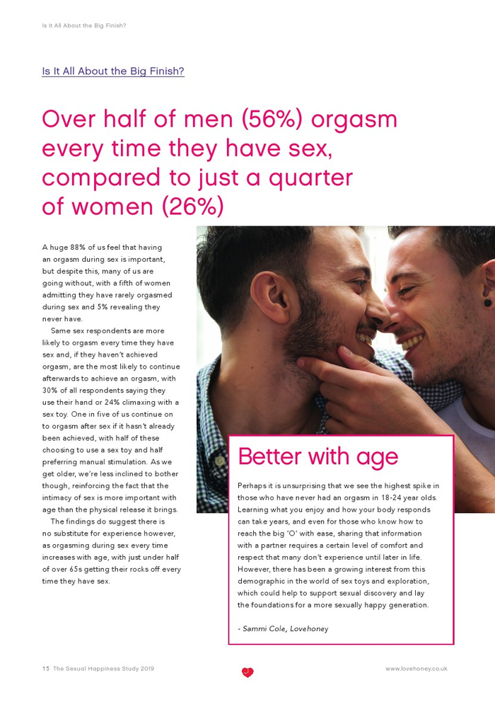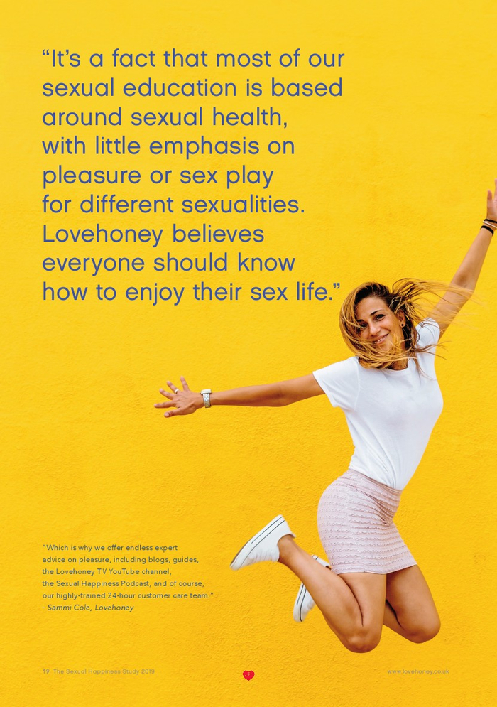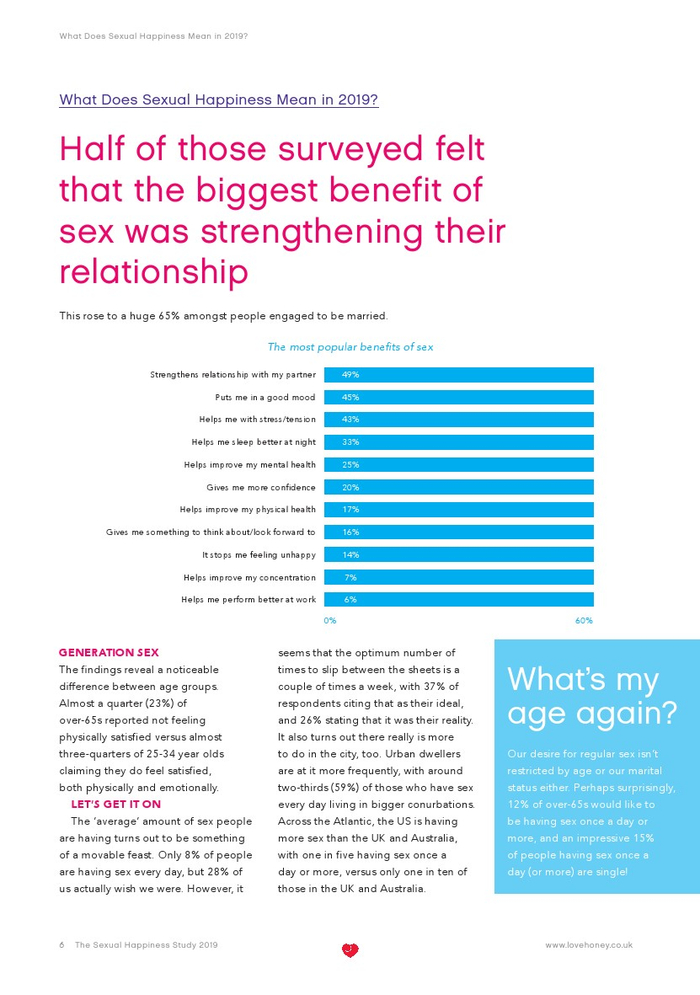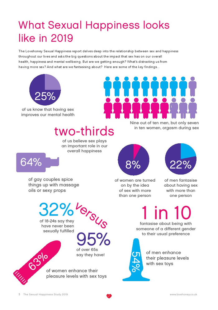 Lovehoney发布了“2019年性福报告”。Lovehoney采访了美国、澳大利亚和英国等3000名年龄在18到65岁以上的成年人。对性心理进行的调查希望确定性在幸福感(身体和情感)中扮演着什么角色,以及这种作用在一生中是如何变化的。
