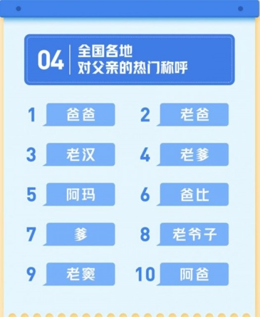 由于地域方言差别,全国各地居民对于“父亲”有不同称呼。头条搜索显示,“爸爸”、“老爸”和“老汉”是最热门的“父亲”称呼。广州地区对父亲的叫法“老窦”、满族的父亲称谓“阿玛”也入选前十。用户调研发现,不少喜欢古装剧的用户喜欢在社交App上将父亲备注为“阿玛”。