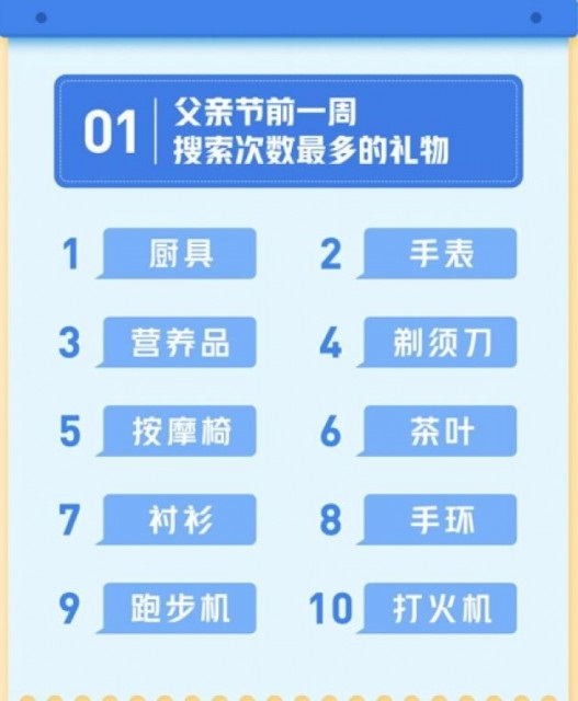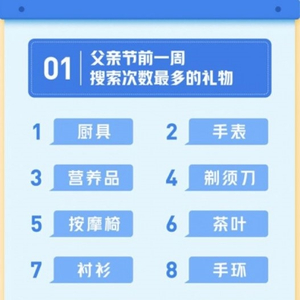 头条搜索发布的父亲节报告显示,厨具是头条平台上最热门的父亲节礼物。其余依次为手表、营养品、剃须刀和按摩椅。此前,头条搜索还发布过母亲节热门礼物清单,枕头、围巾、康乃馨、项链和包包等物品入围。相比之下,父亲节热门礼物的实用元素占比更高。