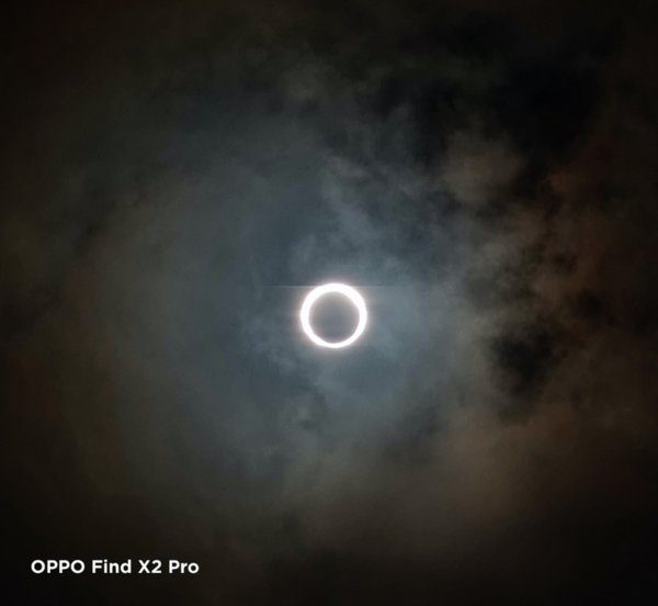 这是一张OPPO Find X2 Pro 手机刚刚纪录的日环食照片,因为本次日环食的状态非常接近全食,太阳被遮挡剩下的金边非常细,所以我们也可以称之为金边日环食。本次可观测到日环食的中国地区包括西藏、四川、 重庆、贵州、湖南、江西、福建、台湾等地。从 OPPO Find X2 Pro 记录下的画面可以看到西藏地区的日环食景色非常壮观。