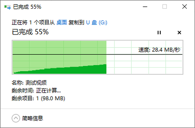 可以看到,实际的写入速度也能达到25MB/s以上,与前面的跑分测试基本相当。虽然慢于读写速度,但也基本够用了,快速拷贝一般大小的视频与图片,是毫无压力的。