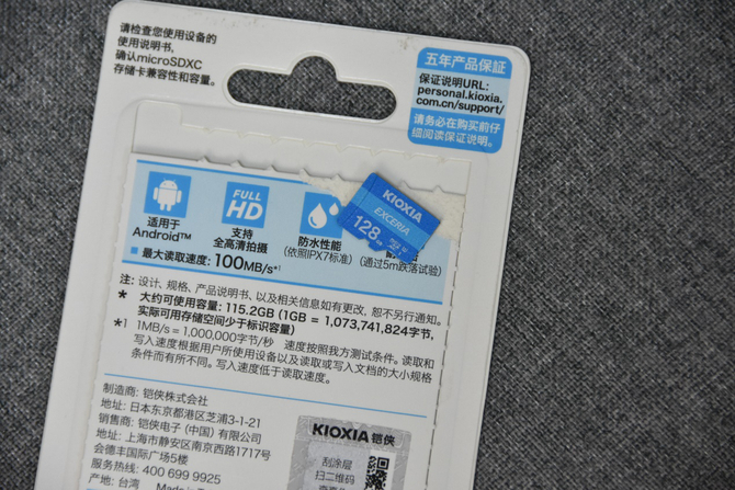 包装的背部,表示了这款铠侠EXCERIA 极至瞬速系列 microSD存储卡对Android系统有很要的兼容性、最高可达100MB/s读取速度满足全高清视频录制/回放的要求;此外这款产品还达到了IP7级防水标准、并通过了5m跌落测试实验,也支持抗冲击、防静电、防X射线、耐过热等特性,再结合铠侠官方提供的5年产品质保,用户可以更放心的使用。