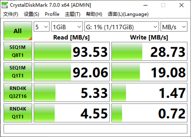 CrystalDiskMark是一款常用的存储器速度测试软件,除了可以测试机械硬盘、固态硬盘的速度以外,也能对存储卡进行测试。在此项测试中,铠侠EXCERIA 极至瞬速系列microSD存储卡128GB版的读写速度为93.53MB/s、写入速度为28.73MB/s,基本上符合官方宣传的数据,速度表现达到了预期。