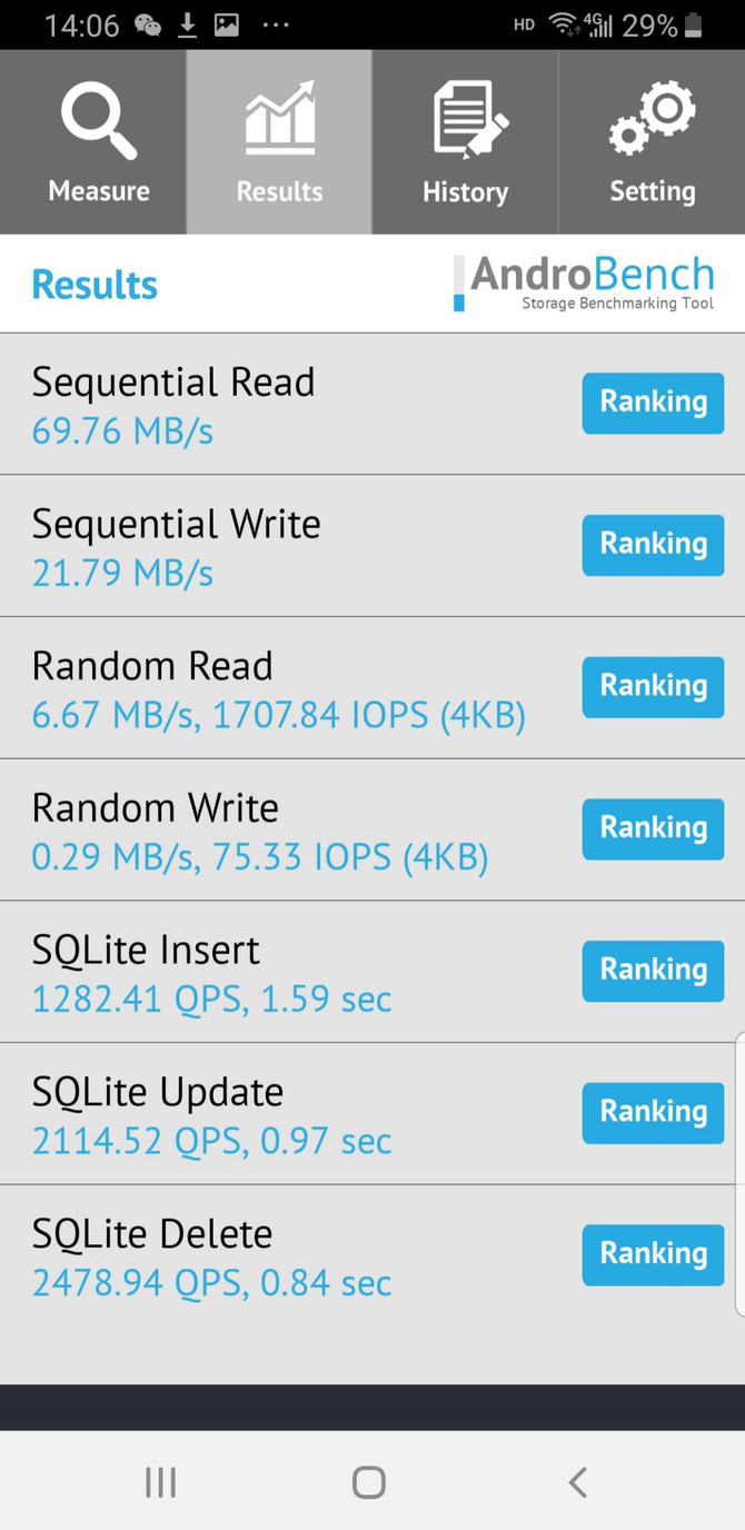 使用AndroBench进行测试,顺序读取速度为69.76MB/s、写入速度为21.79MB/s,4K随机读取为1707.84IOPS、随机写入75.33IOPS,速度表现尚可,而超大容量也能很好的起到扩容作用,腾出内置存储的宝贵空间。