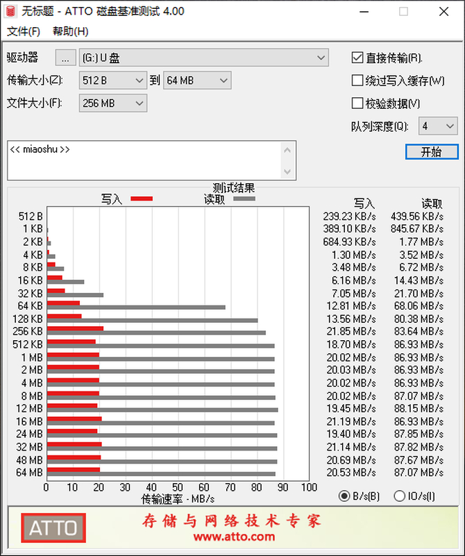 而在ATTO Disk Benchmark测试中,铠侠EXCERIA 极至瞬速系列microSD存储卡128GB版的最大读取速度为88.15MB/s,数据和前面的两项测试结果也差不多。