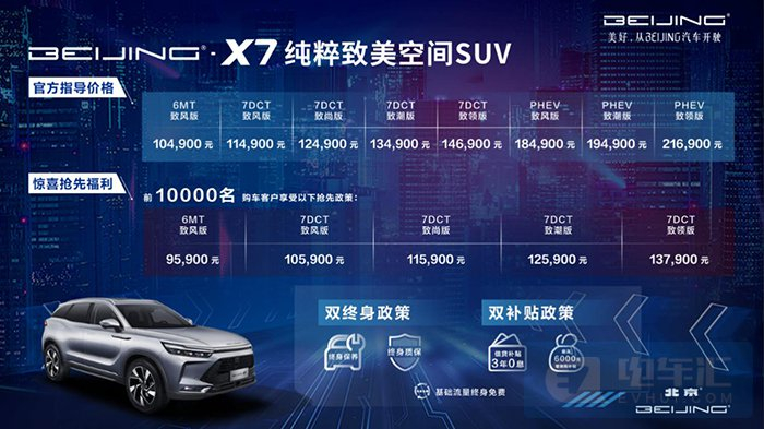 定位为纯粹致美空间SUV的BEIJING-X7,拥有BMFA魔方架构和大都致美设计理念双重加持,兼具纯粹空间、纯粹设计、纯粹科技、纯粹安全四大核心卖点。此次上市的BEIJING-X7燃油车型共5款,官方指导价10.49万元-14.69万元。3款PHEV车型价格也同期发布。