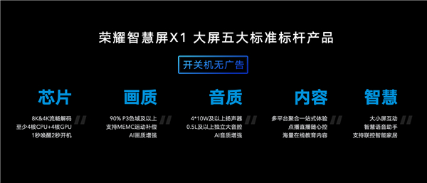 初次做大屏产品,荣耀就给自己定下了五大标准,致力于在芯片、画质、音质、内容及智慧上给消费者带来更好的体验,而且一开始就立下了一条铁规——绝不加开关机广告,这是大屏产品过去几年中最让人深恶痛绝的地方,严重影响了消费者体验。