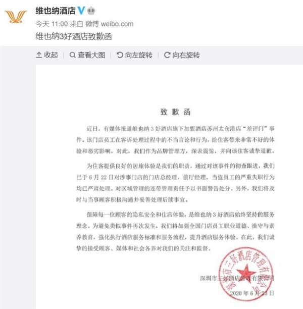 保障每一位顾客的隐私安全和住店体验,是维也纳3好酒店始终坚持的服务理念。为避免类似事件再次发生,我们将加强全国门店员工职业道德、操守与素养教育,强化执行酒店服务标准和服务流程,提升酒店服务体验。