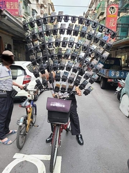 早在 2018 年的时候,陈老先生就凭借“腰缠11部智能机”而登上媒体头条。随后到了2019年的时候,他又升级了一辆自行车,像孔雀开屏似地在自行车手把上罗列了45部智能机。