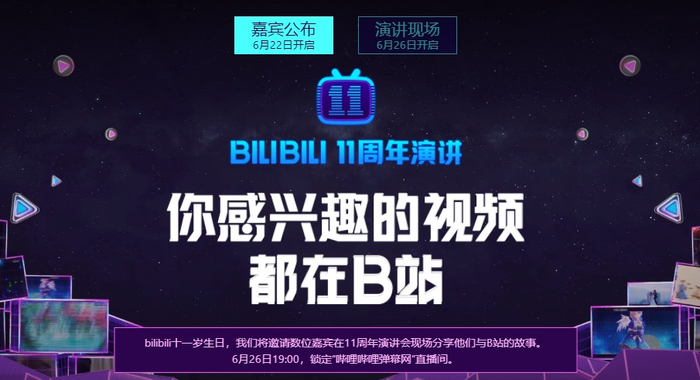 6月26日消息 2020 年 6 月 26 日,哔哩哔哩(简称 “B 站”)迎来 11 周岁生日。在这一天,B 站将举办 11 周年演讲活动,并邀请包括 UP 主 “机智的党妹”、“罗翔说刑法”、歌唱家腾格尔、歌手周深在内的数位嘉宾分享他们与 B 站的故事。