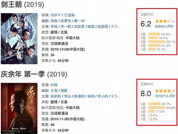 由此,《剑王朝》预期质量可以对标同档期的《庆余年》。冯氏喜剧、美术设计、“夜宴”风格等元素也成为关注焦点。可《剑王朝》自首播两天后,不仅热度收视垫底,豆瓣评分跌至6.2分,与爆款《庆余年》形成鲜明对比。