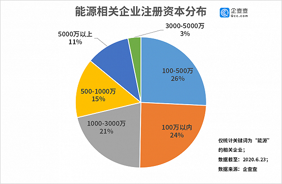 从注册资本来看,能源相关企业的注册资本分布较为均匀,没有集中在某个数值区间的态势。相对而言,注册资本在100-500万元的企业数量较多,占比约为26%,注册资本在100万元以内的企业数量次之,约为24%。