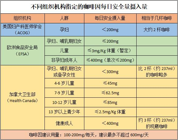 对于一个正常成年人来说,每天摄入不超过400mg的咖啡因是安全的,育龄女性每天的咖啡因摄入量应该低于300mg,孕妇和乳母则应该控制在200mg以下。如果长时间摄入超出安全量的咖啡因,就会对身体造成伤害了。