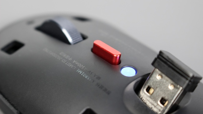 掀开鼠标的顶盖就能看到收纳其中的USB接收器,顶盖采用的是磁吸连接,不用每次开盖都担心掰断卡扣。