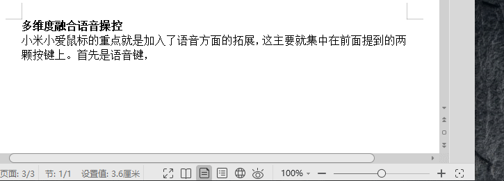 小米小爱鼠标的重点就是加入了语音方面的拓展,这主要就集中在前面提到的两颗按键上。首先是语音键,短按语音键可以实现语音转文字功能,在不太吵闹的办公室中使用,文字识别准确度还是不错的,小爱也会根据完整句意对整句转写进行修订,聊天这样的场景中使用问题不大。
