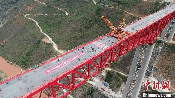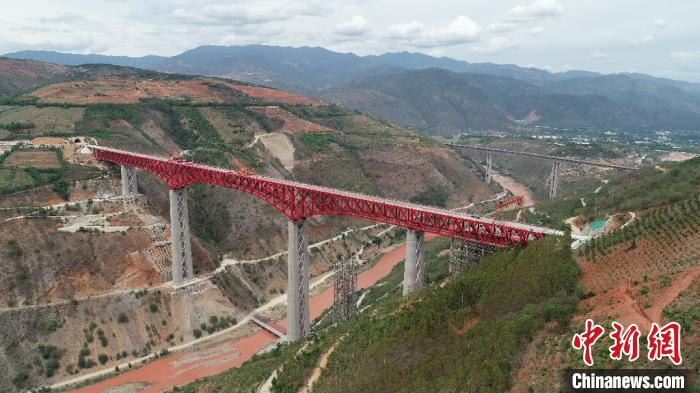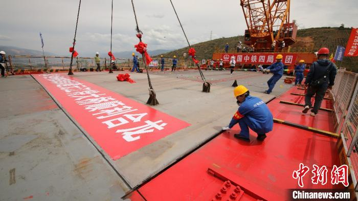 7月1日,随着最后一块桥面板精准落入预定位置,由中国中铁四局承建的中(中国)老(老挝)铁路中国段玉(玉溪)磨(磨憨)铁路元江双线特大桥顺利实现合龙。图为航拍合龙过程。 黄晨东 摄