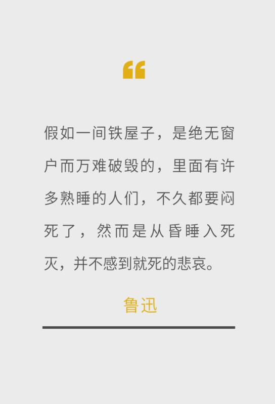 「假如一间铁屋子,是绝无窗户而万难破毁的,里面有许多熟睡的人们,不久都要闷死了,然而是从昏睡入死灭,并不感到就死的悲哀。]