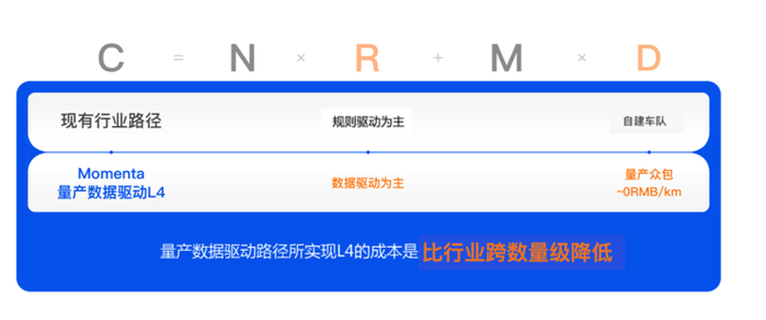 得益于量产数据驱动的方式,Momenta能够跨数量级地降低解决单个问题的研发成本(R)和单公里数据成本(D)。