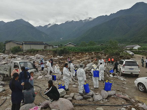 疾控部门人员正在发生山洪的村子展开消杀工作。摄影:赵孟