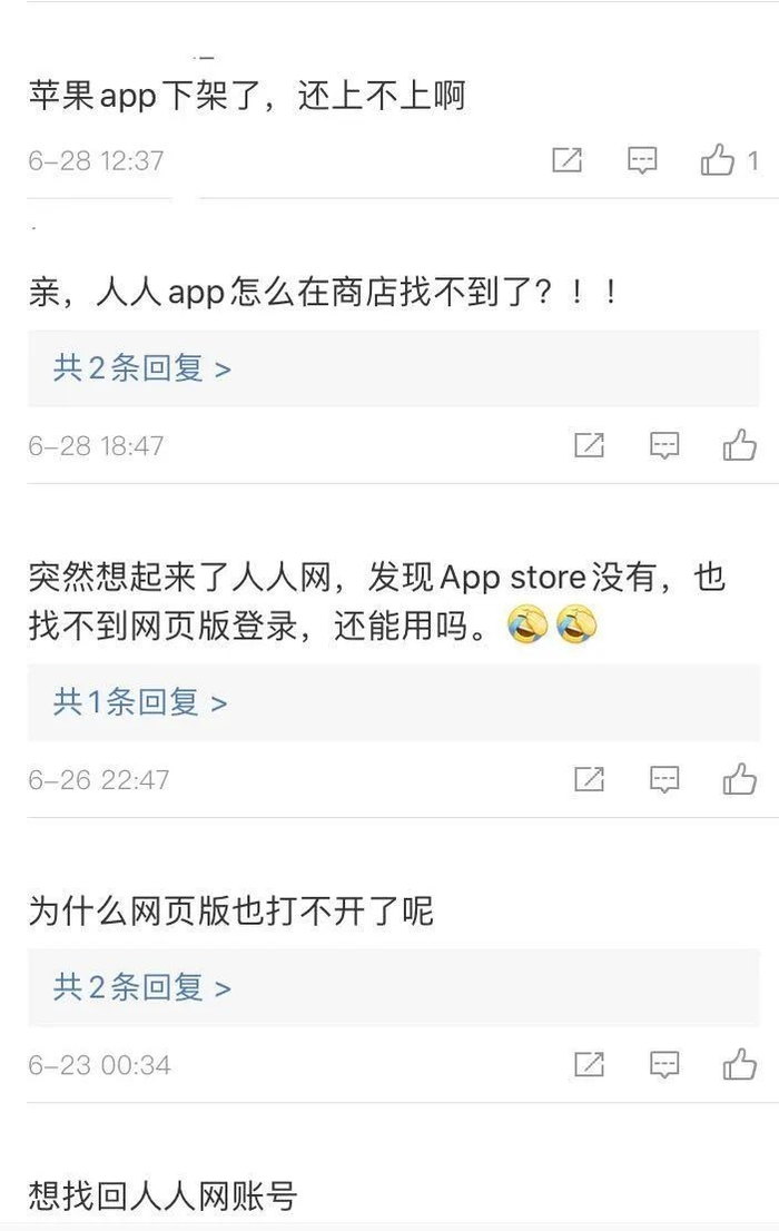 人人网的官方微博虽然还在每天坚持更新鸡汤和热点,但也是冷冷清清,只是在置顶微博下,还有几个用户留言询问:“人人app怎么在商店里找不到了?”“还能用么?”“人人网崩溃了?”