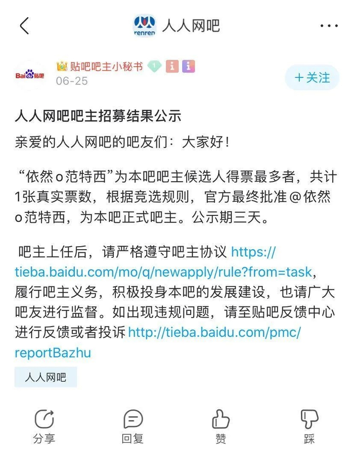 6月25日,某网友以1票当选人人网吧主,人人网吧曾累计有9.7w关注,27.2w帖子