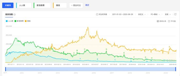 人人网、新浪微博、微信百度搜索指数变化,蓝色为人人网,绿色为新浪微博,橘色为微信
