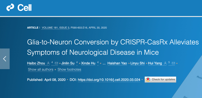 4 月 28 日,杨辉团队在 Cell 发文,报告通过运用最新开发的 RNA 靶向 CRISPR 系统 CasRx 特异性地在视网膜穆勒胶质细胞中敲低 PTBP1 基因的表达,首次在成体中实现了视神经节细胞的再生,并且恢复了永久性视力损伤模型小鼠的视力。同时,该研究还证明了这项技术可以非常高效且特异地将纹状体内的星形胶质细胞转分化成多巴胺神经元,并且基本消除了帕金森疾病的症状。