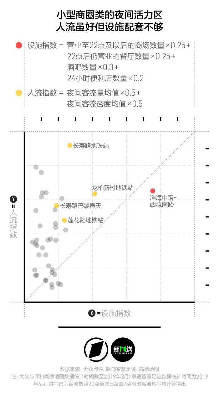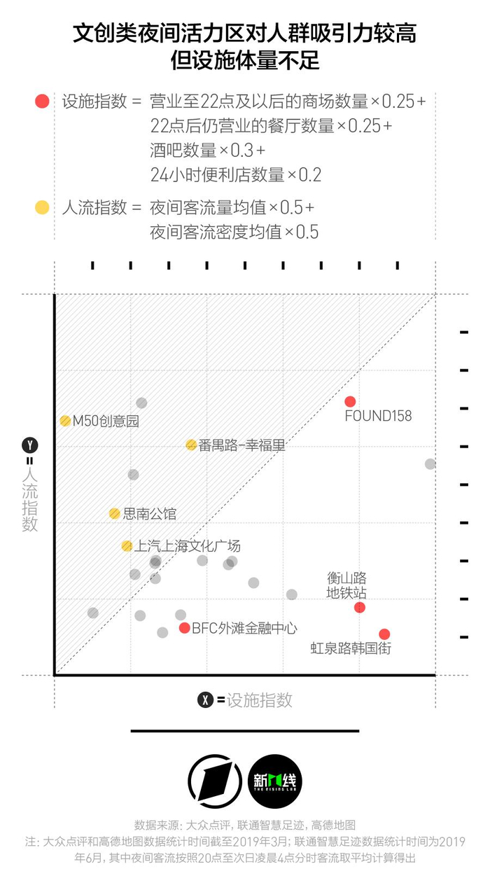 从上图看,番禺路-幸福里、思南公馆、上汽上海文化广场、M50创意园等,均在靠左上的区域,也就是说,这类夜间活力区对人群吸引力高,但设施却没那么充足。