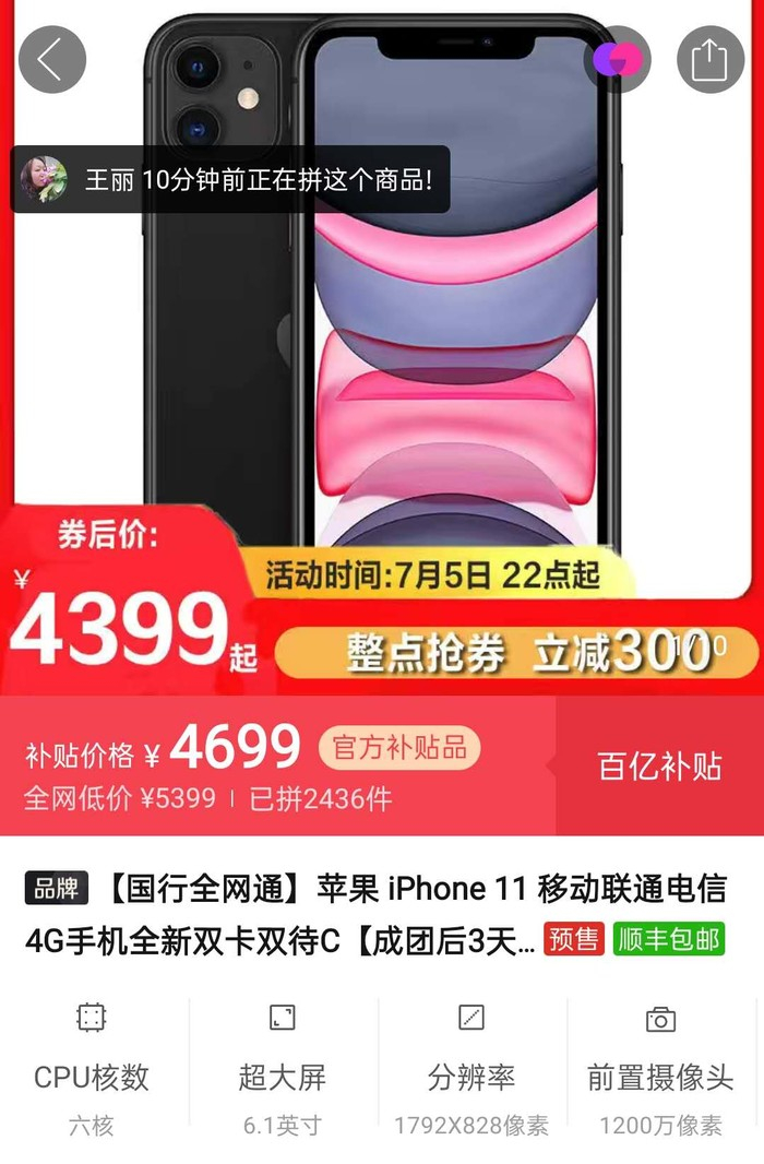 但是如果是去海南旅游购物的话,可以顺便买一台自用也是不错的,但是目前某多多第三方平台上的iPhone 11 128GB版售价是5100元与海南免税版相差不到100元,在618等电商活动中,第三方平台上的iPhone打折力度反而比海南免税版更大!