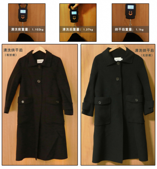 由于烘干与否我们很难通过肉眼分辨,所以我们通过重量的变化加以。清洗前,毛呢大衣的重量为1.102KG,清洗甩干后为1.37KG,继而选择羊毛烘模式,进行1小时57分钟的烘干后,其重量为1.1KG,较之于之前减轻了0.002KG的重量,除去可能存在的误差外,这么小的数值差应为洗掉的灰尘以及清洗烘干除掉的毛屑。同时烘干后更小的数值,也更加证明干衣机强大的烘干能力。