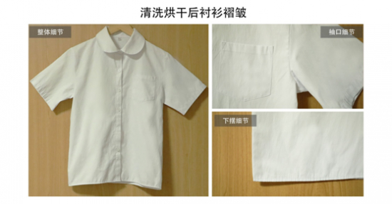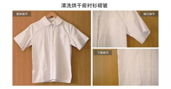 我们选择了一款纯白棉质半袖衬衫,手洗晾干后,衣服上遍布褶皱,即便在晾晒前已经抻过也还是如此。