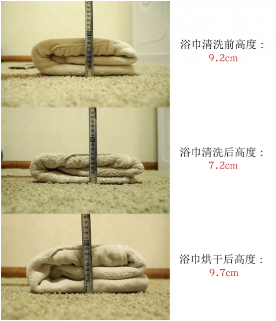 我们将浴巾进行折叠,测量其高度为9.2cm。清洗后,以相同的方式折叠,高度为7.2cm,继而选择精细织物烘干模式,通过了1小时39分钟的烘干后,以相同方式折叠,高度为9.7cm,小熊浴巾在清洁烘干后,“身高”不减反增,可见,烘干使其愈发蓬松。
