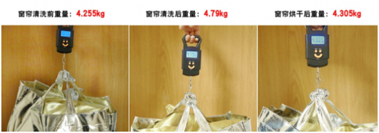 同样还是通过测量重量的方式反映烘干效果。清洗前,窗帘的重量为4.255KG,清洗甩干后的重量为4.79KG,而通过1小时39分钟的化纤烘干模式烘干后,其重量为4.305KG。