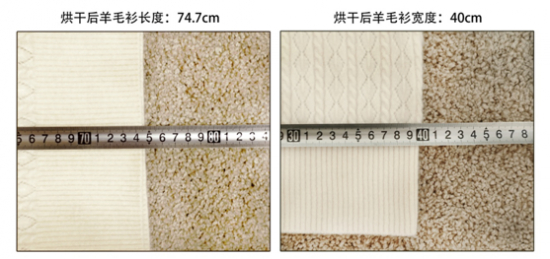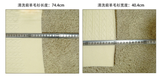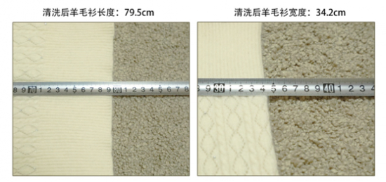 虽然使用洗衣机清洗时选择的是“羊毛洗”功能,但羊毛衫还是变了形,经实际测量,清洗后的羊毛衫长度为79.5cm,宽度为34.2cm,可见,衣物发生了很严重的变形。