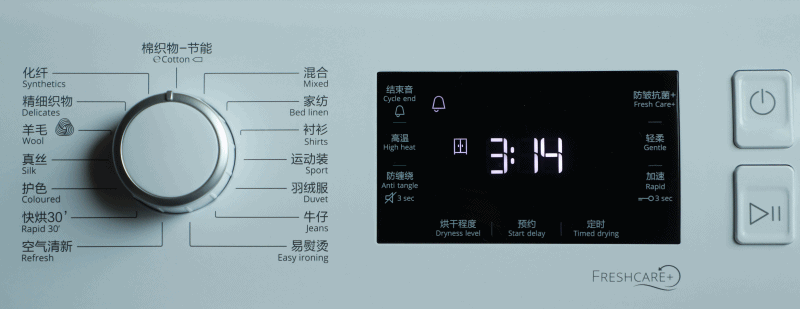 这款干衣机根据不同材质,共划分出14种烘干模式,烘干所需时间也从30分钟到4小时52分钟不等,另有20分钟的空气清新功能有效去除衣物异味。并且其“第六感”技术还可以有效识别烘干程度,自动延长或缩短烘干时间。