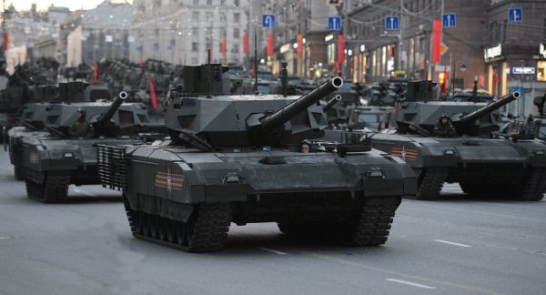 资料图片:参加“胜利日”阅兵彩排的俄军T-14坦克方队。(俄罗斯卫星通讯社网站)