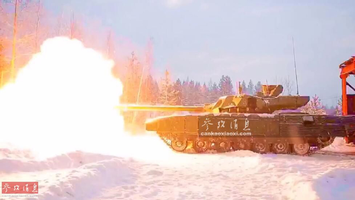 俄军T-14坦克使用125毫米主炮打靶动态图。