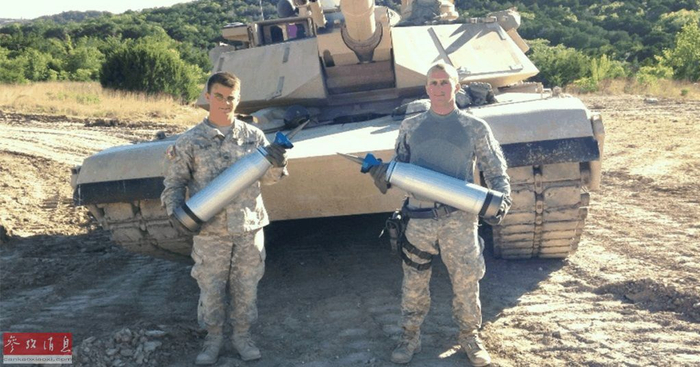 M1A2可发射M829A4脱壳尾翼稳定穿甲弹(APFSDS),配备贫铀弹头,破甲厚度超900毫米RHA(轧制均质装甲),美军称使用这种穿甲弹时,M1A2能击穿配备有“接触-5”爆炸反应装甲(ERA)的俄制T-72或T-90坦克。图为美军坦克兵手持M829穿甲弹在M1A2坦克前合影。