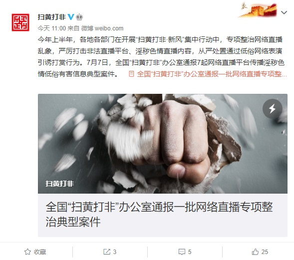 7月7日消息 据扫黄打非官方发布,今年上半年,各地各部门在开展 “扫黄打非 · 新风”集中行动中,专项整治网络直播乱象,严厉打击非法直播平台、淫秽色情直播内容,从严处置通过低俗网络表演引诱打赏行为。7 月 7 日,全国 “扫黄打非”办公室通报 7 起网络直播平台传播淫秽色情低俗有害信息典型案件。