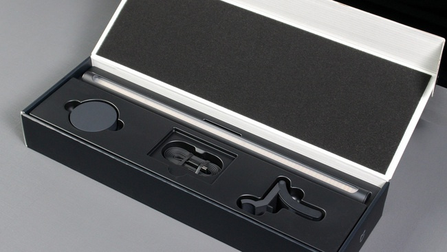 包装顶盖内侧有缓冲海绵,掀开盒子就能看到1大3小的配件严丝合缝地躺在包装中,最长的就是灯管,下方依次是「无线遥控器」、「Type-C电源线」、「挂灯底座」,包装整体颇为细致,也加强了灯具这样的易碎物品在运输过程中的安全性。