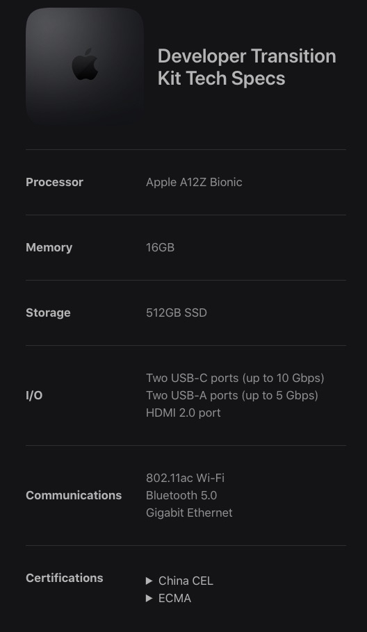 对于普通用户,就比较遗憾了,你不会在苹果官网上找到 DTK 的购买入口——跑去 Apple Store 甩出五张$100大钞也是没有用的。整个快速启动计划,包括 DTK 硬件本身,都是严格提供给开发者使用的。