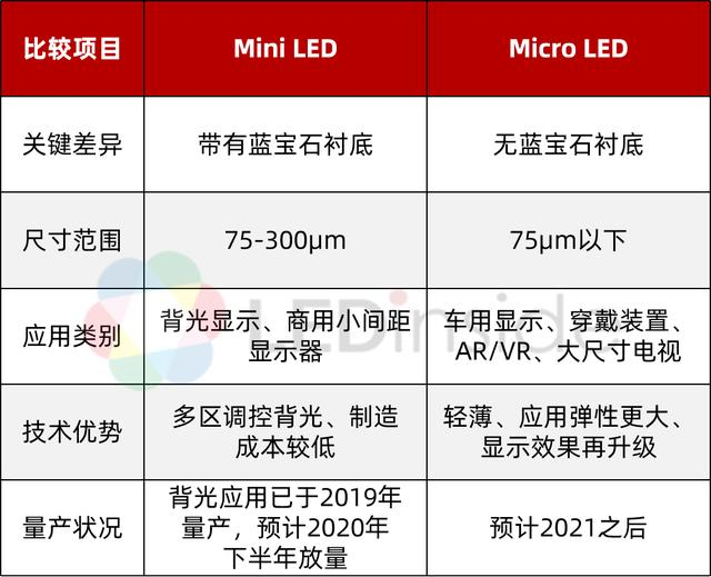 过去LEDinside将100微米(micron/μm)作为Micro LED及Mini LED的尺寸分界,定义芯片尺寸在100微米以上的为Mini LED,小于100微米的则是Micro LED。然而,由于近来相关技术持续进展,厂商已经能够制造出尺寸小于100微米但仍带有蓝宝石衬底的Mini LED产品。因此,LEDinside重新将Micro LED的尺寸界定为75微米以下,且不带蓝宝石衬底。