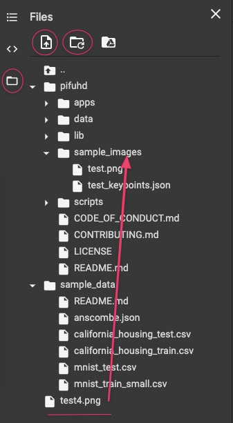 点击页面左边的文件夹,点击刷新,上传你的图片文件(最好是.png,实测.jpg等其他格式偶尔报错),然后把上传好的文件拖拽到 /pifuhd/sample_images 文件夹里