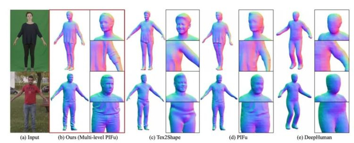 结合两个 PIFu 模块的结果,PIFuHD 实现了其目标,从一张照片中得到了高清晰度、细节丰富的3D重建模型,并且对于内存等计算资源的依赖更少,还其它已知3D重建算法直接对高清输入图像重建出1024*1024分辨率的3D模型。以及,其它方法经常出现的“假象”,在这一新方法中也有效避免。
