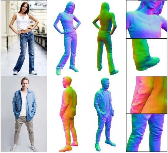 这篇 PIFuHD 论文的目标,是对单张照片上穿着衣服的人进行高细节的3D重建,分辨率足以识别手指、面部特征、衣服褶皱等详细的信息。