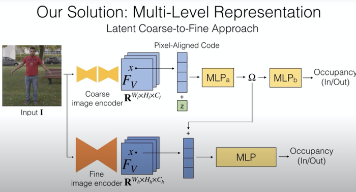 考虑到整个研究的限制,输入图像是单一的、正面的照片,背部的细节根本不存在,也就无法真的“重建”,只能靠猜。而猜的工作,是由两个模块都具备的多层感知器 (Multilayer Perceptron, MLP) 进行的。