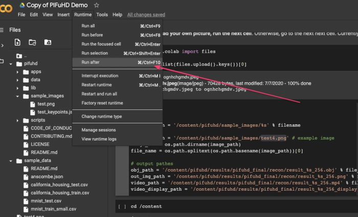 然后,点击菜单栏的代码执行程序 (Runtime),选择“运行当前单元格以及其后的所有单元格”,或者用键盘快捷键输入⌘/Ctrl+F10即可。