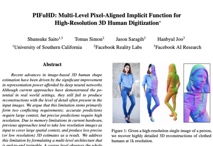 这篇论文的设计巧妙,也提出和引用了很多计算机视觉领域和3D重建方向最新的概念。论文由Facebook 的人工智能实验室、Facebook现实实验室(原 Oculus Research)和南加州大学共同进行,第一作者为 Shunsuke Saito。