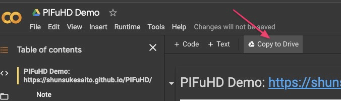 首先访问论文的展示页面 https://shunsukesaito.github.io/PIFuHD/,点击"Demo"链接,进入 Google Colab;点击下图中这个按钮: