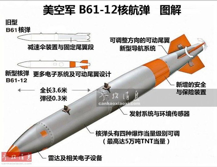 作为该系列的最新代表,B61-12预计将于2020年服役,为应对美军的最新战略需要,该型核弹也进行了多项革命性改进。尽管外形变化不大,B61-12采用了“GPS+惯导”复合制导方式,“圆概率误差”(CEP)可控制在30米内,尾部去除了减速伞,弹翼改为可动式设计。图为B61-12核弹图解。